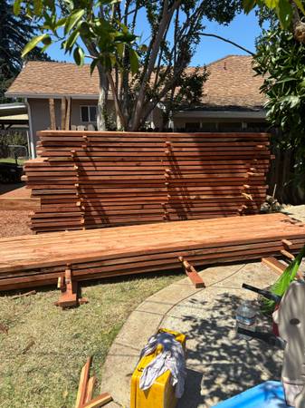 All wood was salvaged from two 85 ft tall redwoods that stood in the backyard. Perfect building material for a high-end deck or other project. Contractors preferred who plan on purchasing most or all the material. If purchasing all the material, a bulk discount price reduction will apply.