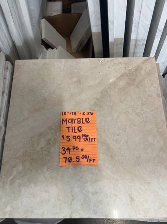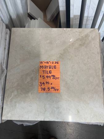 I have marble Tiles for clearance sale 18” x 18” and 2.25 sq/ft per piece x 34 pieces = 76.50 sq/ft left only $5.99 per sq/ft come visit our warehouse. And have much more items sale.