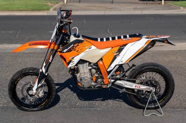Finished in signature orange and white KTM colors, this EXC-R features high-end components like Excel Takasago wheels, WP suspension, a Guts Racing seat, and both electric and kick start options. It also has a clean California title, street-legal registration, and an optional dirt wheel/tire set for just $500 more. These bikes are some of the most fun you can have on 2 wheels, especially weighing in at only 275 lbs wet.