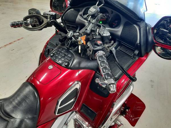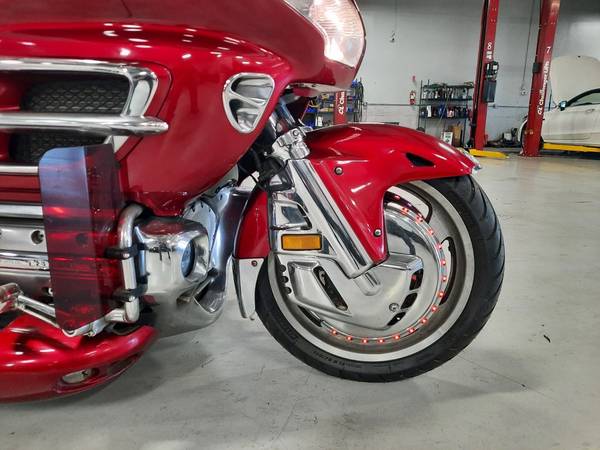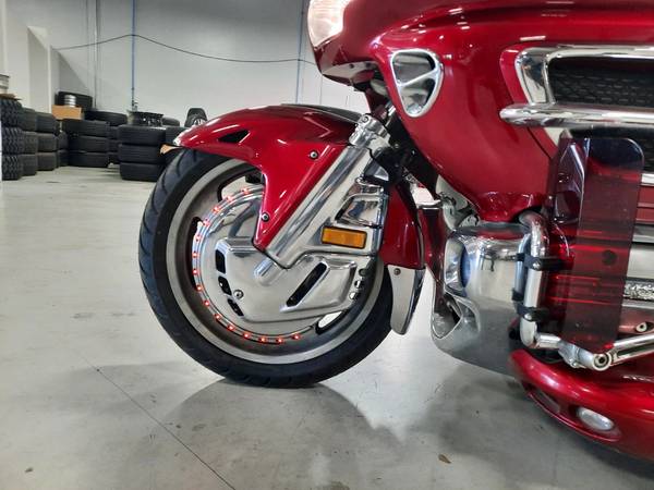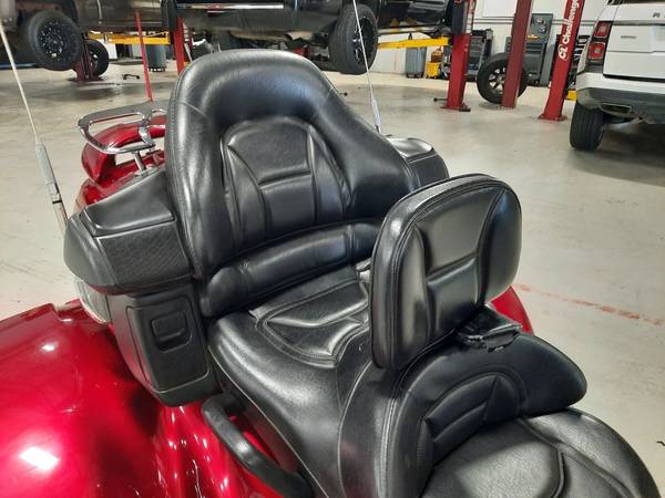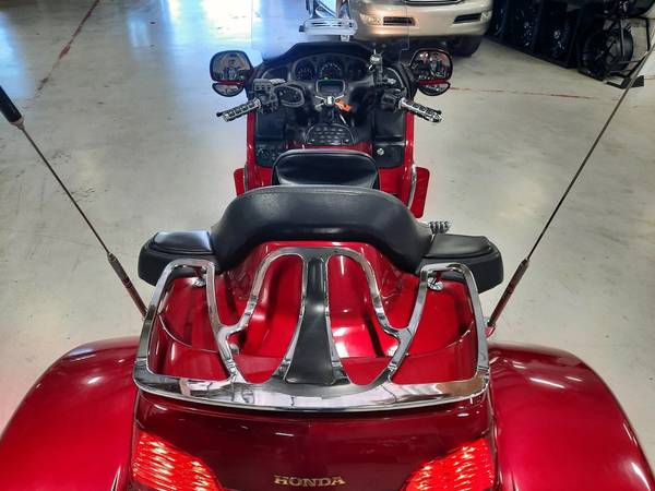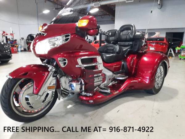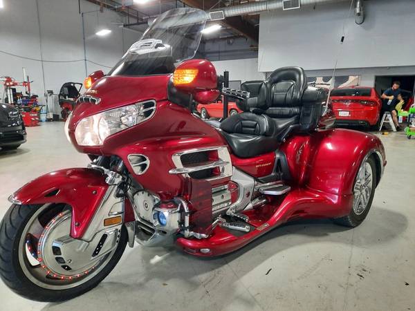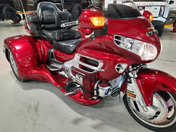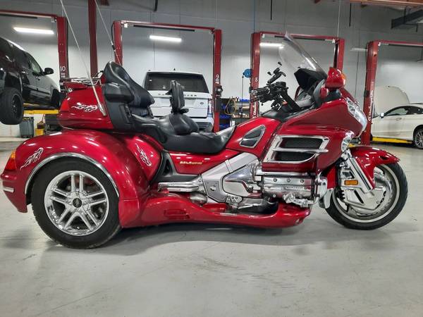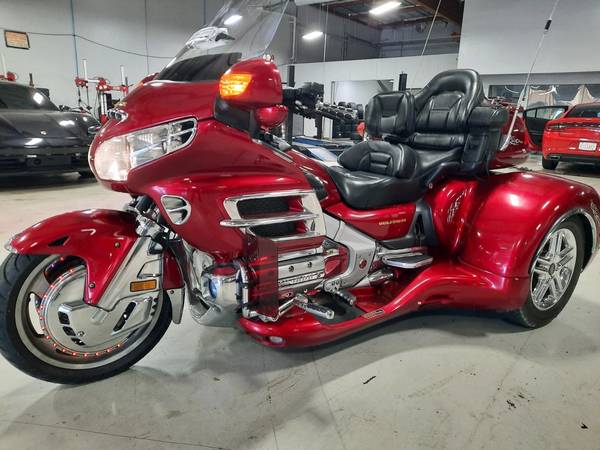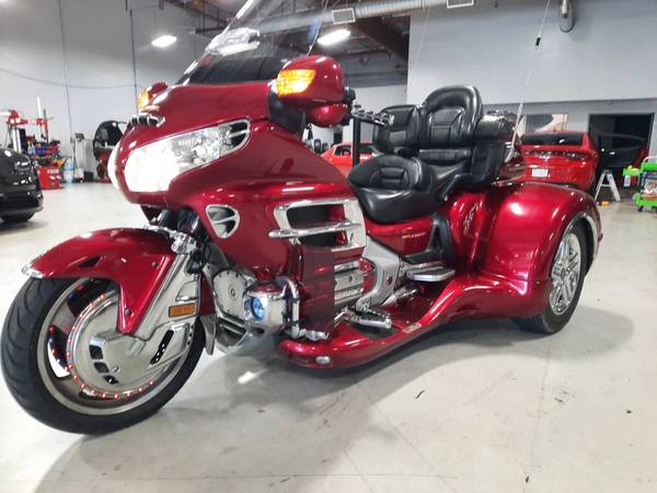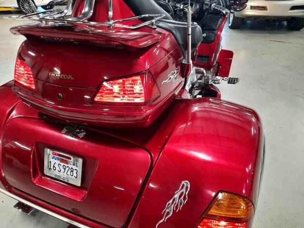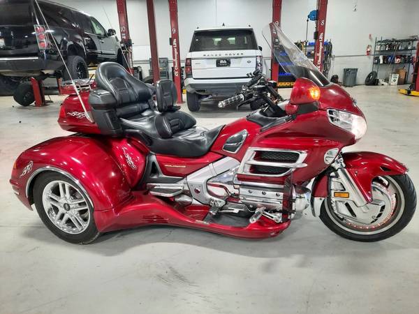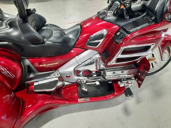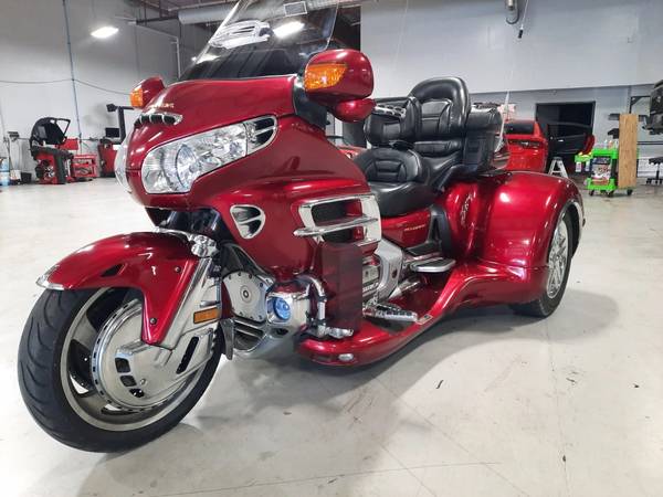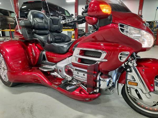 A Beautiful 2003 Honda Goldwing 1800 Trike. This Trike has a complete and professional MOTOR TRIKE Independent Rear Suspension conversion by (one of the biggest and best trike manufacturers) And it has adjustable Air-Ride as well to fine tune your comfort and riding experience. It is the Best and Most comfortable riding Trike on the market. It is of course in Absolutely Perfect condition, has a (Beautiful CANDY DURANGO RED factory paint Job, and Lot's of Extras & chrome goodies And is Very clean looking). driver cruising full foot boards, King & Queen Seat. This Beautiful Trike has only senior citizen driven EXTREMELY LOW Miles on her and it's a Goldwing so the Engine and transmission run smooth and shift perfectly as it should, and will most likely be the last Trike it's next owner will ever need to buy. A Great price for an Amazing machine like this.