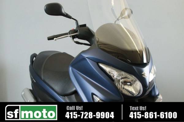 2022 Suzuki Burgman 200 ABS 2022 Suzuki Burgman 200 at SF Moto Ready to Ride? Your 2022 Suzuki Burgman 200 Awaits! Prepare to elevate your urban adventure! Here at SF Moto, San Francisco's #1 Multi-Line Motorcycle and Scooter Dealership, we're thrilled to present an opportunity that's simply too good to miss: a pristine 2022 Suzuki Burgman 200 with ABS brakes and an incredibly low 878 miles. This isn't just a scooter; it's your ticket to effortlessly navigating the city, transforming your daily commute into a joyous escape. With barely any miles on the clock, this Burgman is practically brand new, offering all the reliability and performance of a fresh ride without the new-vehicle price tag. Why the 2022 Suzuki Burgman 200 is Your Next Ride: Effortless Power & Smooth Ride: At its heart lies a responsive 200cc, liquid- cooled, fuel-injected, SOHC, four- stroke engine paired with a seamless Continuously Variable Transmission (CVT). This means twist-and-go simplicity and smooth, consistent power, perfect for zipping through traffic or cruising along scenic routes. Superior Safety with ABS: The integrated Anti-lock Brake System (ABS) provides an extra layer of confidence and control. You'll benefit from enhanced stopping power and stability, especially in unpredictable San Francisco conditions. Practicality Meets Comfort: Designed for the modern rider, the Burgman 200 features a plush, double-stitched seat and specially designed cutaway floorboards for exceptional comfort. The generous 41-liter under-seat storage compartment can easily swallow two full-face helmets or your daily essentials, making errands or quick trips a breeze. Plus, you'll find convenient front storage compartments, including a 12V DC power outlet to keep your devices charged. Intuitive Technology: The easy-to-read instrument cluster keeps you informed with a clear speedometer, odometer, dual trip meters, fuel gauge, and an Eco Drive indicator to help you maximize fuel efficiency. Agile and Nimble: With a lightweight chassis and finely tuned suspension, the Burgman 200 is incredibly easy to maneuver, making light work of city traffic and tight parking spots. And as a testament to our commitment to your satisfaction, this incredible Burgman 200 comes with our exclusive SF Moto 90 Day Signature Warranty. This is your assurance of quality and peace of mind from San Francisco's most trusted dealership. Don't just commute; experience the city on your terms. This 2022 Suzuki Burgman 200 is waiting to be your perfect urban companion. Stop by SF Moto today and discover why it's the smartest choice for sophisticated and convenient two-wheeled travel! Please come by, call, text or email us for the total price All listed pricing includes the use of any and all factory incentives and rebates Pricing does exclude any dealer document preparation charges, dealer markup, dealer set-up, destination charges, government fees and taxes or any applicable finance charges Call or Text us at(415) 728-9904 SF Moto is open Monday - Saturday 10 am - 6 pm. Be sure to check out the 58+ photos we post on our website, sfmoto.com , of all of our pre-owned motorcycles and scooters. ALL of our pre-owned inventory INCLUDES our SF Moto Signature 90-Day Warranty and Lifetime Service Discount! WARNING: Operating, servicing and maintaining a passenger vehicle, or an off-highway motor vehicle can expose you to chemicals including engine exhaust, carbon monoxide, phthalates, and lead, which are known to the State of California to cause cancer and birth defects or other reproductive harm. To minimize exposure, avoid breathing exhaust, do not idle the engine except as necessary, service your vehicle or vessel in a well-ventilated area and wear gloves or wash your hands frequently when servicing your vehicle or vessel. For more information go to https://www.p65warnings.ca.gov/products/passenger-vehicle - - - Contact SF Moto at(415) 728-9904 or for more information. - A little bit about us