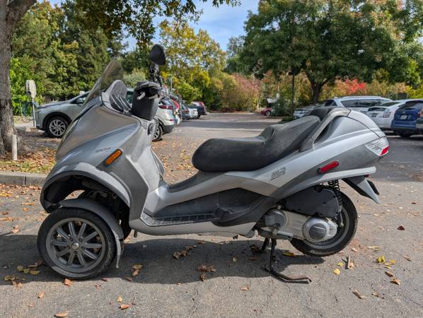 This scooter is a lot of fun - the front two wheels tilt in tandem when you turn. You get incredible grip while taking turns and very short breaking distance due to two patches road contact up front. Great for wet conditions or if you hit some gravel/grit while taking a turn. I took this for a few rides out past Beryessa and it was a blast. It has a good deal of storage space too and is comfy.