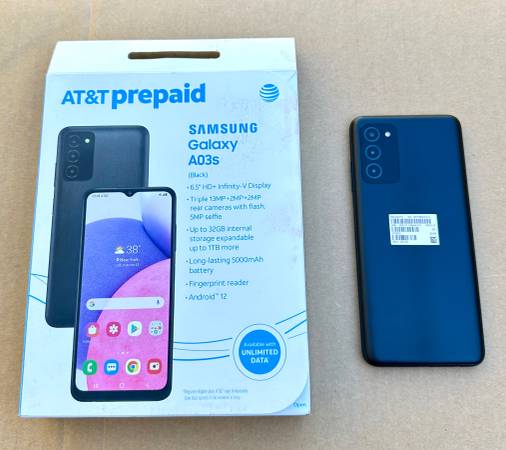 New in box SAMSUNG GALAXY A03s (32 GB) Android Smartphone. 6.5 inch screen, triple camera. Clean IMEI. Works with Boost Mobile. Includes phone, charger, and box. $65 or best offer, 916-521-71seven6.