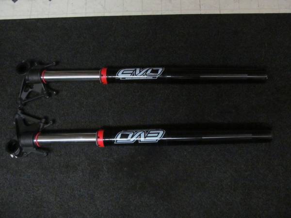 Last items are rear shock and front forks from a 2023 890 Adventure S. Taken off when new to be re-valved and re-springed? for a 175lb. rider by EVOOREGON.COM in Oregon. Ended up using shortened R suspension that offered a greater adjustment than the S suspension does. An upgrade from earlier S suspension sets with adjustable compression and rebound on the forks. Rear shock has remote preload, hard/soft adjuster, and measures 14.5" eye to eye. Front forks measure 34" from the fork cap to the axle center, and 8 5/8" from the bottom of the fork leg to the top of the axle clamp bracket. Perfect if wanting to lower your R chassis, upgrade your older suspension, or to replace damaged components. Rear shock part number online is 6637C429U313000, on the shock is 0637C429U313000-01, with a KTM list new at $1,595, $500 for like new. Front fork set part number 05586S2901 with a KTM list of $2,707 for the pair, $900 for like new and improved.