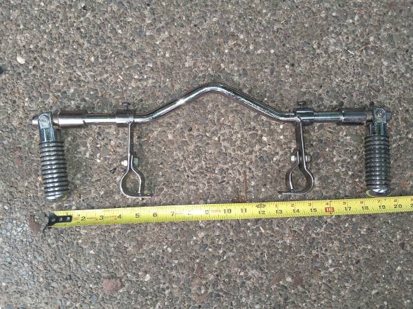 Fold up motorcycle foot pegs with o- rings. ~27" wide when extended, 20" wide when folded. $15