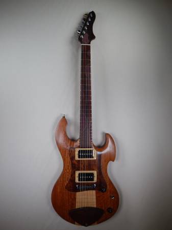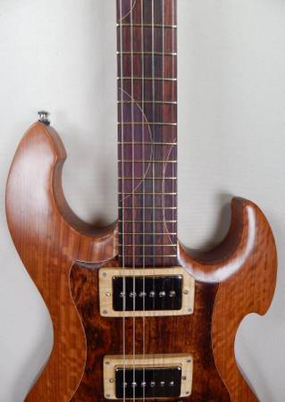 We've got a stunning one of a kind Christian Allen Lutherie guitar with Duncan Fat Cats, five pieces mahogany neck and purple heart/ebony fingerboard with two way truss, purple heart inlaid pickguard. Gotoh bridge, Gotoh locking tuners: list is $3200.00 but the builder will let it go for $2720.00, comes with a very nice padded gig bag. See pics below.