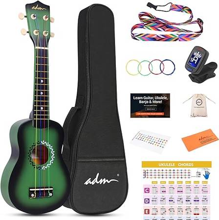 ADM Soprano Ukulele for Beginners. 21 Inch Hawaiian Wood Ukelele Kit, for Kids Adults, Students & Professionals. Starter Ukulele Pack / Bundle with Free Lesson Gig Bag, Strap, Nylon Strings, Tuner & Picks. With Green Brust Finish.
