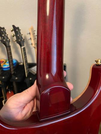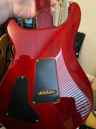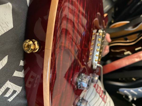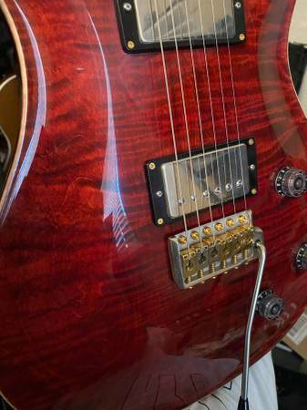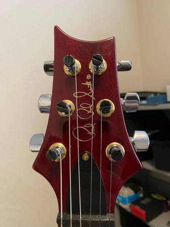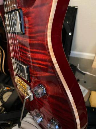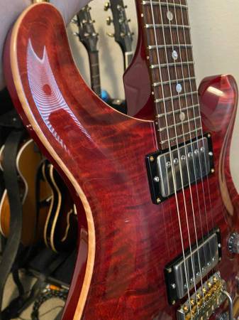 This beautiful USA-made instrument features a 22-fret Wide Fat neck carve with mother-of-pearl and abalone moon inlays. The gorgeous mahogany back is covered with a gorgeous flame maple top. This model features the highly sought-after Dragon II humbuckers, known for their articulate mids, extended highs, and a bit more bite than the typical vintage-voiced PRS pickups. 5-way rotary switch and mixed hardware (Gold and Nickel)