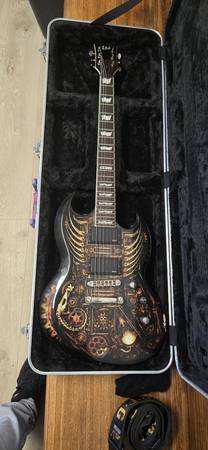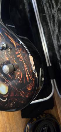 Its an amazing shred machine from a forgotten series by ESP/LTD. It offers 81/85 EMG active pickups, 24.75 fret scale setup in Drop C tuning for heavy and face melting riffs. It offers everything a metal head would want, plus a kick ass steam punk/horror aesthetic. Only blemish is in the photo shown, at the bottom of the guitar body. Neck is straight as an arrow and plays like butter.