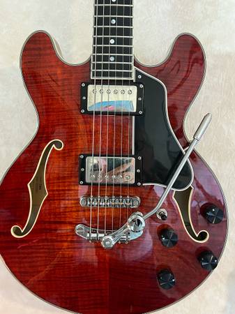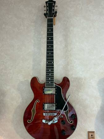 Like new Eastman T-484 with upgrades. $1200 and UP (without upgrades)on Reverb! Pretty close to new condition. This is Eastman’ s spin on the Gibson ES-339. Great playing guitar with a huge variety of tone options. Upgrades include: Deusenberg Les Trem tremolo. Very smooth and stays in tune! Original bridge included. I also put on oversized knobs. The original bridge and knobs are included. Comes with OHSC. Here is a full description from the Eastman web site: