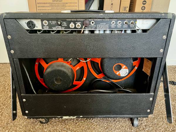 This is a 1977 Fender Twin Reverb — one of the great clean, high-headroom amps of all time. It’s the 135-watt Silverface era model with the push/pull master volume and factory JBL “orange frame” speakers, which are highly sought after for their clarity and punch.