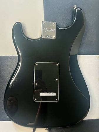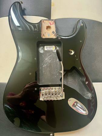 This is a body from a 2015 made in Mexico double fat Stratocaster with tremolo system and neck plate. You can see it’s routed for two humbuckers though you could really drop any pickup configuration into the body.