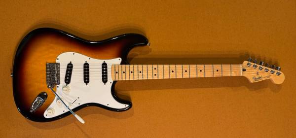 Stratocaster mim upgraded 3 GFS single coil pickups. Upgraded Bronze tremolo block . Also included loaded pick guard and a few other new pick guards miscellaneous fender parts.