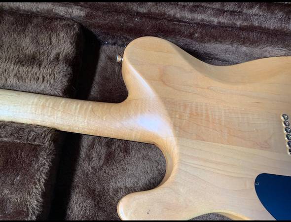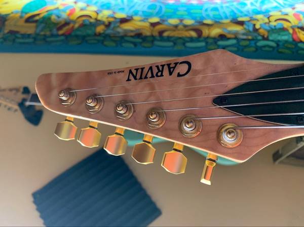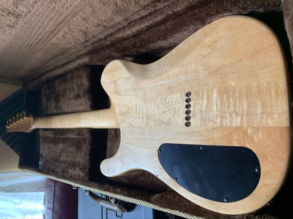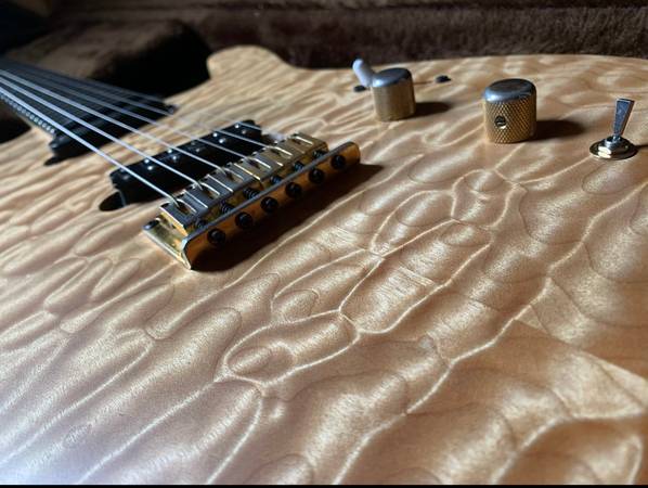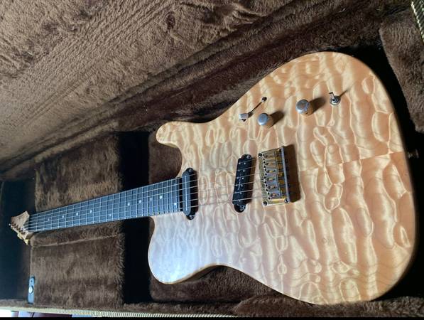 Superb Quilted Maple on body and head stock. Book matching is awesome with a nice thick top. Natural finish. Original Carvin branded rail pickup in the neck and a Seymour Duncan Lil' 59 in the bridge. Series/parallel switch for the bridge pickup. 24- fret ebony neck, neck through with some nice flame on the back. Sperzel locking tuners. OHC is a bit dirty, but works as intended, including the locks.