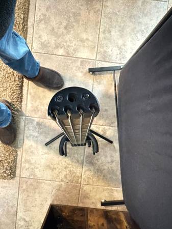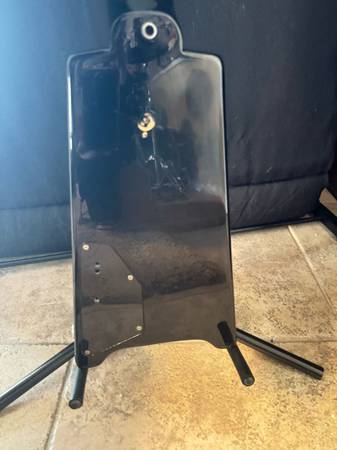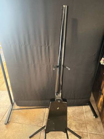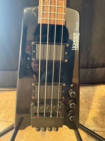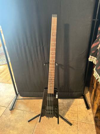 This bass is licensed by and similar to Steinberger. The electronics work as expected. This bass has played a lot of gigs and it shows. The most significant issue is a crack by the knobs. Not noticeable from a few feet away. The dots have some kind of marker on them I assume to be easier to see in stage. I’m always open to trade options, a snare drum or electric guitar would be top of the list but other trades are possible. It does come with a well used gig bag.