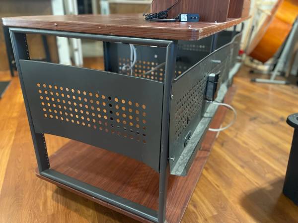 RTA producer station desk in fair condition. Structurally sound but some of the edge trim is peeling off and the cable tray on the back is bent. The black top is shelf paper and can be peeled off. Doesn’t have a keyboard tray or the cd rack.