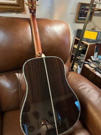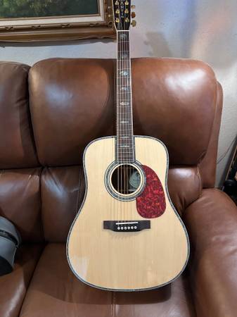 Please note: This is NOT a Martin Guitar; hence the very low price. This is a Chinese made replica of a D-45 and looks and plays beautifully. Does it sound like a genuine D-45? No. Nothing else does. But if you have been looking for a beautiful guitar with abalone inlay that plays quite nicely and looks the part, this guitar is hard to beat. I have two of these for sale. This one and one in the look of the aged toner, a slightly more amber appearance. These guitars are made from what appears to be a rosewood laminate with a Chinese spruce top. They probably sound better than any comparable guitar in this price range. In mint condition. No case is included as they did not come with a case.