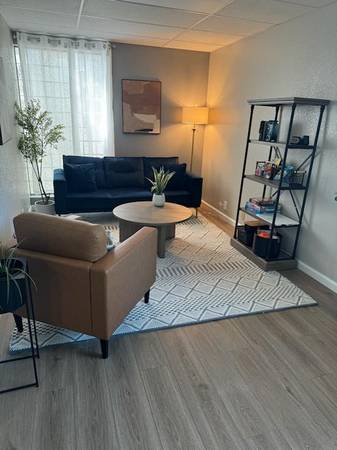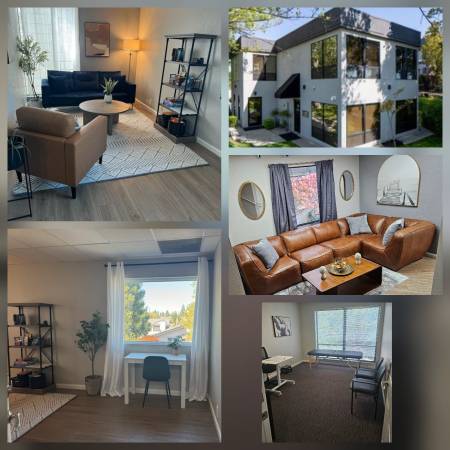 Room 104 is a HUGE PRIVATE Office. IT HAS EXTRA SOUND PROOFING and only shares 1 wall. It has huge window with trees to view. Approximately 12 x 13. $799/month, 30 day terms, deposit equals rent. Carpet. Available Now. Near a sink