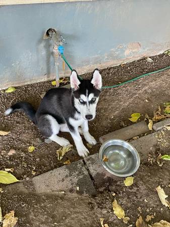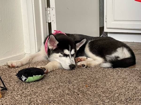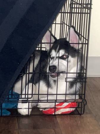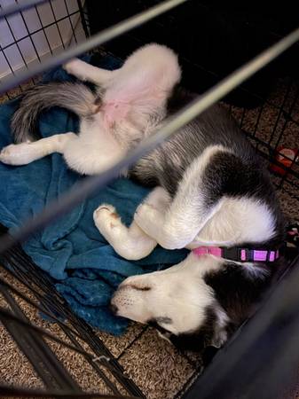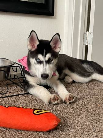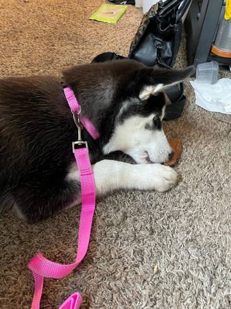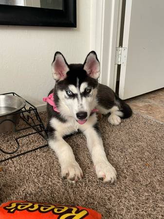 Hello I have a female husky for rehoming!! Shejust turned 4 months old on the 12th and is sooo sweett and cute!! She’s a very playful and goofy puppy!! she has all her shots except her rabies shot!! Shes dog and cat friendly! :) Shes potty and is crate trained! She is starting to learn sit! We’re rehoming her due to not having the time she needs:((! she has sooo much potential and would do absolutely amazing with someone who has more time and who’s more active for her!! She’s realllyyy smart and catches on so quick teaching her the word no , crate training, and to potty training has been a breeze!! There is a rehoming fee of 4oo:) if you’re interested with questions please feel free to text me and ask them!!!:)))