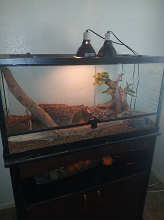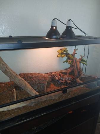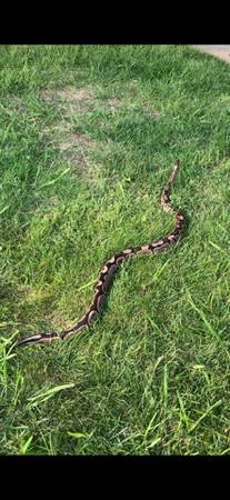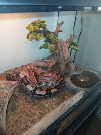 I am rehoming my 6 year old male ball python. He is very docile and used to being handled. I am rehoming him with a 60 gal tank that has a front opening and top opening both with locks. As well as all his accessories, heating and basking lamp, and heating pad. He is a very picky eater and will only eat live male mice which you can get from Petco for $6.49 each. He eats 2 mice once a week. When he is shedding he does not like to eat. If interested please reach out. I will delete post when he is gone. If you want the stand that he is on you can have it as well.