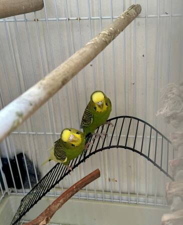 Two young parakeets in need of a good home. Comes with cage and food. Rehoming fee $25