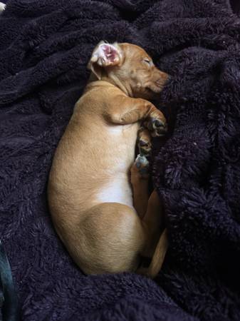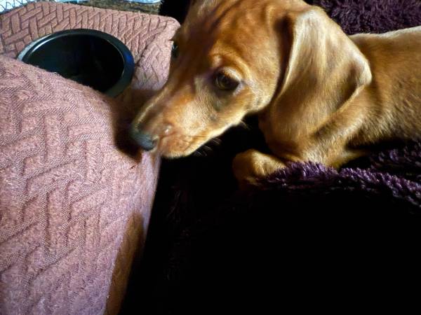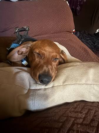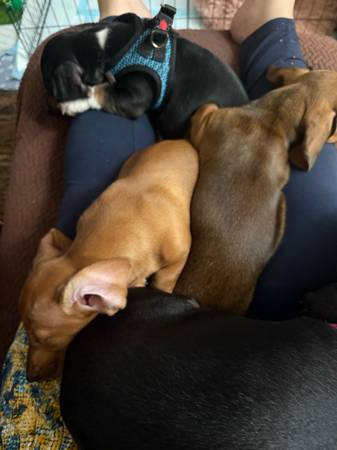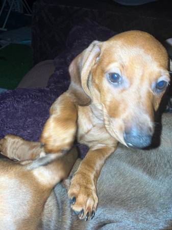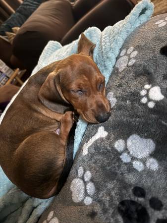 Beautiful male miniature dachshund puppy chocolate/red with black accents. 13 weeks old. Ready to go to his forever home