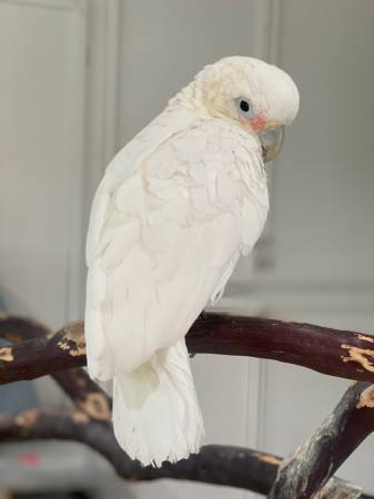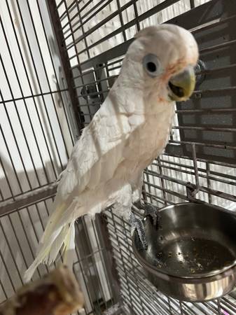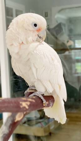 Her name is Stella, she is a sweet cockatoo. Does well with other parrots. Shes not as loud as other cockatoos. Really only scream when shes hungry. She love her veggies / Fruits. Is on either TOPS parrot pellets or Zupreme Naturals. Shes about 6-8 years young. Please email with any questions.