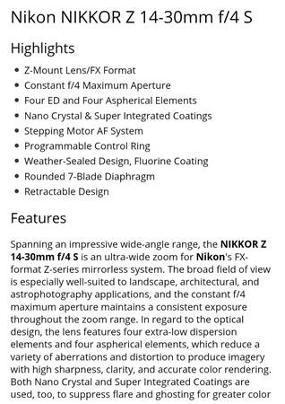 I am selling my beautiful "like new" Nikkor Z 14-30mm f/4 S lens. The only reason is to reduce my kit and I never seem to shoot wide angle very much. This lens is in pristine condition and very well taken care of. The price of $850 is very fair - serious enquiries only please.