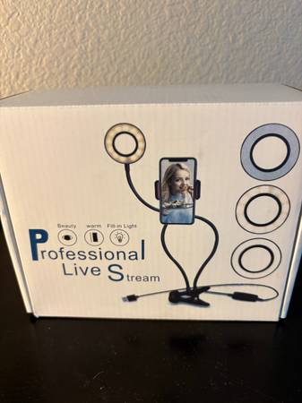 Selfie ring light cell phone holder stand. Art stream Stream. Makeup. 3 light modes Flexible flexible. Arm works all models Android iPhones black clr. New. In box. Local pick up only.