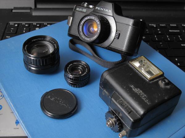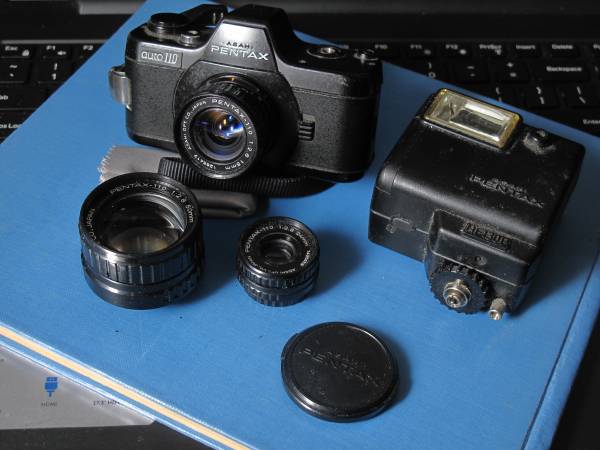 Vtg. Pentax Auto 110 film camera available. Includes 3 Pentax/Asahi lenses and electronic flash. 50mm f/2.8, 24mm f/2.8, 18mm f/2.8(super clean glass). They make a micro 4/3 adapter for these. Has the original carry pouch as well. The camera's shutter doesn't fire even though I installed new LR44 batteries(previous batteries were corroded). Actual items you see here. If you want just lenses only, I'm ok with that. Still $85. Interested, Text/Email/Call me to check it out. Two7nine two2four Four3four THree.