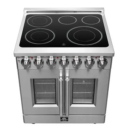 The Forno 30-In Massimo French Door Freestanding Electric Range brings professional styling and quality into your home kitchen with its durable stainless-steel design. The unique french doors allow up to 12" to easily access your oven.The cooking surface has 5 radiant elements with a total output of 9,500 watts that features a Warmer Zone of 100 watts that will always keep your dishes at the ideal temperature. The cooktop surface benefits from a stainless steel surrounding to ensure long-lasting durability. The 4.32 cu. ft. capacity oven has a combined broil and bake output of 4800 watts and 1500 watt true convection fan. Includes Air Fryer Basket, Rack and Drip Pan, 2 telescopic oven racks and 4-prong power cord. Housed in a high-grade stainless steel body and zinc coated metal knobs with bezels. This unit sports a stylish look that is built to last. All Forno products are backed by an iron clad 2-year warranty for your satisfaction. Skip the high price tags without sacrificing quality and performance. Lower the cost of living with Forno.