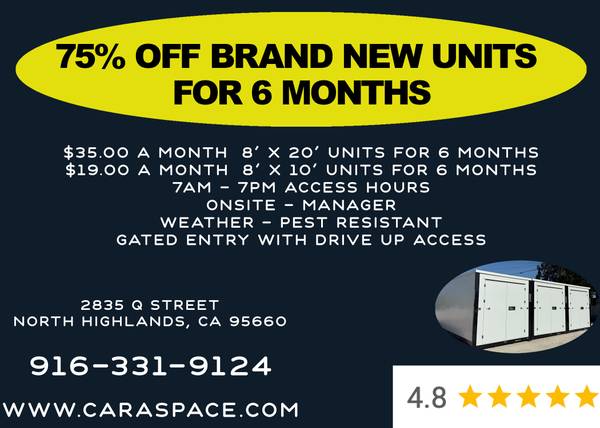 CARASPACE RV STORAGE FACILITY has brand-new 8x10 ($18.75/month) and 8x20 ($35/month) storage units at 75% OFF for 6 months (regularly $75 and $140/month).