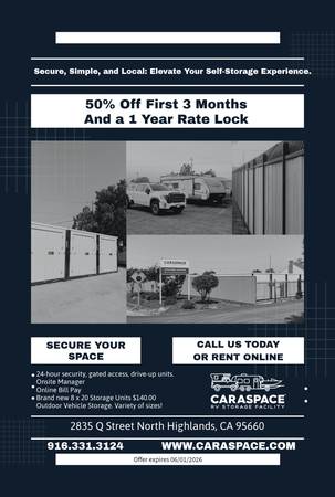 We currently have our 20 ft parking spots on a 1 year rate lock at $60.00 with the first full 3 months being 50% off at $30.00 & our 30 ft parking spots on a 1 year rate lock at $85.00 with the first full 3 months being 50% off at $42.50. Call today to set up a time to come & rent in person, or feel free to go ahead & rent online via our website www.caraspace.com !