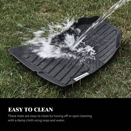 • Designed with sculpted channels to trap rain, snow, mud, fallen leaves, food debris, liquids, and other debris. The raised side walls prevent fluids from leaking onto the carpets. These floor liners and trunk mats provide exceptional protection in various weather conditions and are easy to clean without leaving any dirt behind.