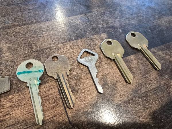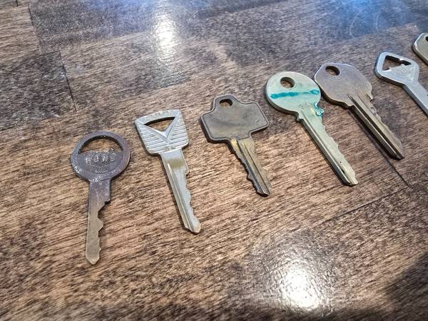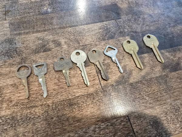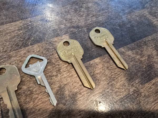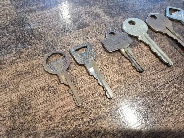 8 Assorted Vintage Keys for $30. They have normal wear as pictured. A few of them are Ford vehicle keys. I believe one is for a Harley Davidson motorcycle. The right two Curtis Ind. Cleveland Ohio PT-1 are blanks.