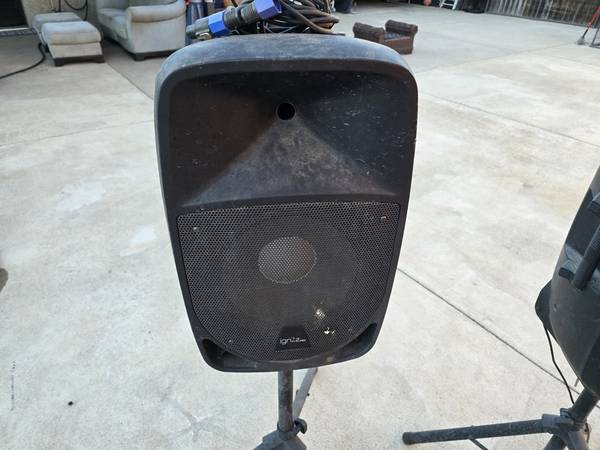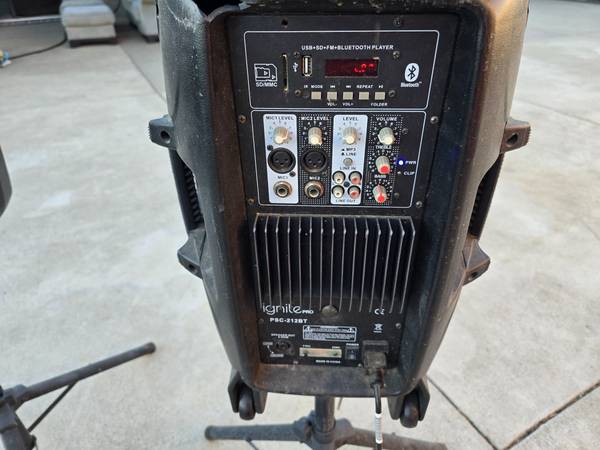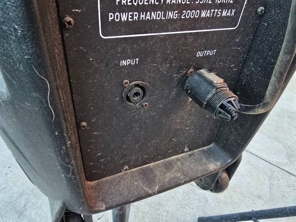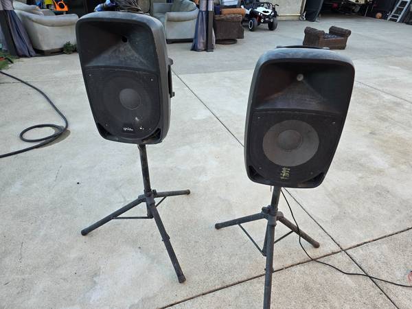 Outdoor Ignite Pro 12" Speakers for $5. They fell and the main one works, but has a crack on the top case as pictured. The other speaker's connector broke when it fell. It worked previous. They are weathered as pictured. The stands are worth the price. The Bluetooth is a little bit of a pain to connect a new phone, but works like a charm with a previous phone.