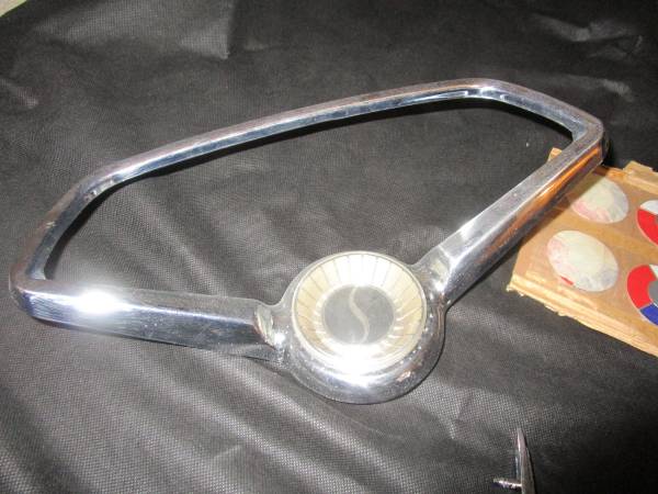 $50.00 - HORN RING: 1963-1966 Studebaker Horn Ring + Center Button + Clear Plastic Cover - Has Part numbers: 1556991 / H-28585 - Horn ring: Solid and straight with no Cracks or missing pieces. Some lite chrome pitting