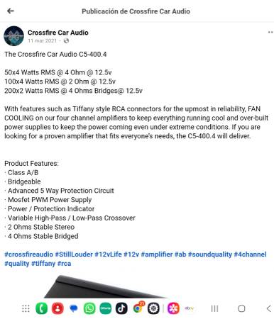 Amp almost new CROSSFIRE C5-400.4 50rms at 4-ohm 100rms at 2-ohm 200rms on mode bridged at 4-ohm stable just ask $170
