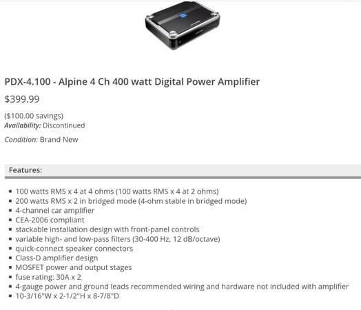 Amp ALPINE PDX4.100 4ch 100rms per channel at 4-ohm and 2-ohm 200rms on mode bridged at 4-ohm stable just ask $300