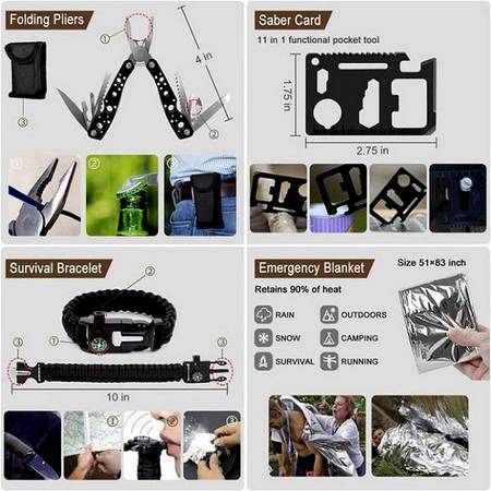 238Pcs Emergency Survival Kit, Professional Survival Gear Tool with Tactical Molle Pouch and Emergency Tent for Earthquake238 in 1 Survival Kit]: emergency survival kit is unique in that it was specifically designed and curated by survival experts. The comprehensive survival system not only includes 22pcs multipurpose survival tools and a emergency tent and blanket and extra 4in1 shovel & pick, but it also offers 45pcs first aid kit & 100 cotton swabs, 50pcs disposable gloves and a fishing tools set which can meet your different needs and solve problem of looking for food outdoors.