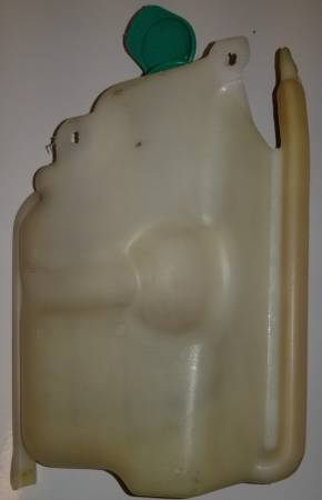 Coolant Reservoir: $20 Plastic is still pliable (not brittle like most). Pretty sure I pulled this from a 1974 Dart slant at PicN'Pull, but check against yours. I don't know if V-8 engines used a different reservoir. I gave it a rough cleaning. It might clean up brighter if you use a TSP solution inside or Evap-O-Rust. It think areas of yellowish are due to rust coating on the inside (rather than degraded plastic) since it turned white where I could reach to scrub inside at the top. I couldn't fit this in my 1965 Dart V-8 so used another bottle. Has been sitting in my garage for ~10 years.