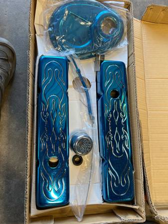 New Powder coated chrome small block Chevy valve covers, timing chain cover, timing pointer, breather and dipstick. Blue metal flake stock high. Fits almost all Chevy small blocks till center bolt valve covers started does not fit early Chevy small blocks with off set valve cover bolts. Use chat or text.