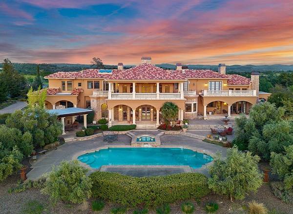 Discover unparalleled luxury in this 6,948 SF Mediterranean masterpiece nestled on 4.8 private acres in exclusive Clover Valley Ranch Estates. Revel in breathtaking panoramic views and experience elegance with 23' ceilings, reclaimed French oak floors, and antique European fireplaces. The gourmet kitchen dazzles with concrete countertops and a black granite island. Enjoy four en-suite bedrooms, including a primary suite on the second floor, plus two offices and an entertaining game room. Outdoor amenities boast a resort-style 50'x25' pool/spa, outdoor kitchen with pizza oven, citrus grove, and more. Modern comforts include solar energy, advanced HVAC, and comprehensive irrigation. Indulge in true California living.