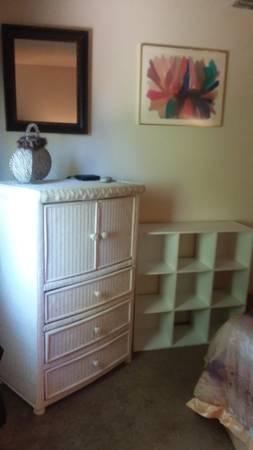 Nicely Furnished room with queen-sized bed, dresser, nightstand, lamps, and Smart TV