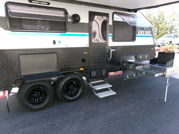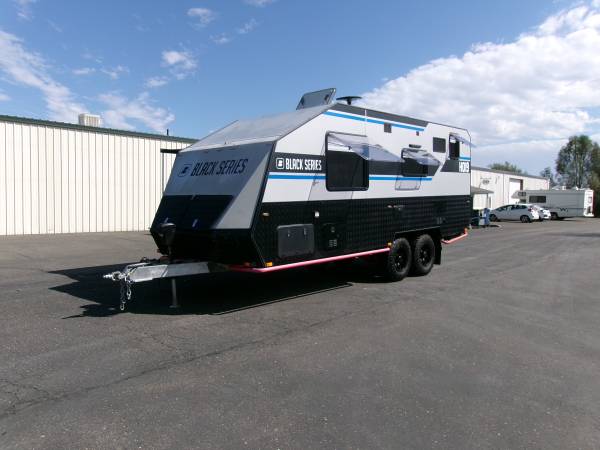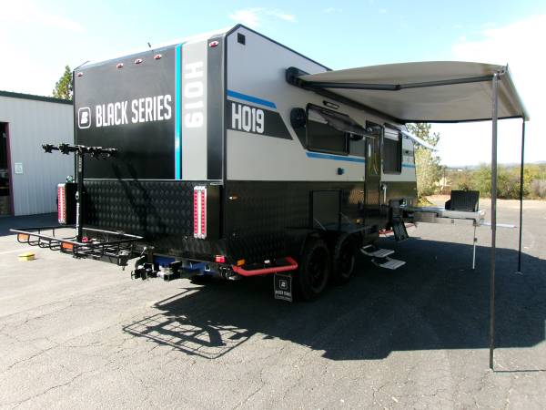 The Black Series Camper travel trailer were specifically designed to go on diverse and expansive terrain! These trailers have high quality and intense durability so that you can have great luxury while away from home. You will find solar panels to use when you are off-grid, and there is a 12V/120V electrical system and 100AH batteries for power.