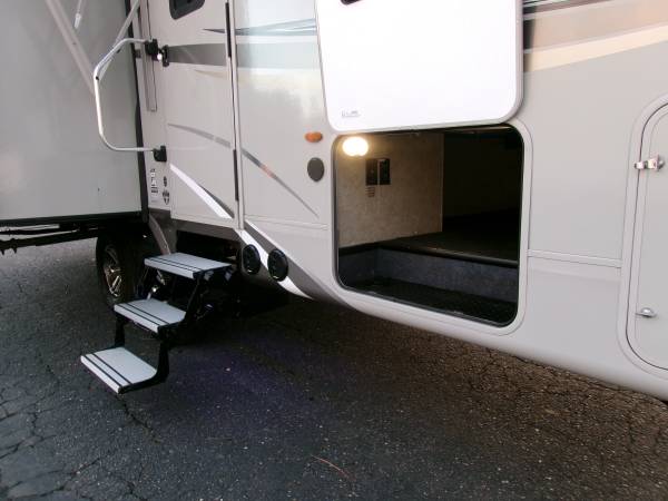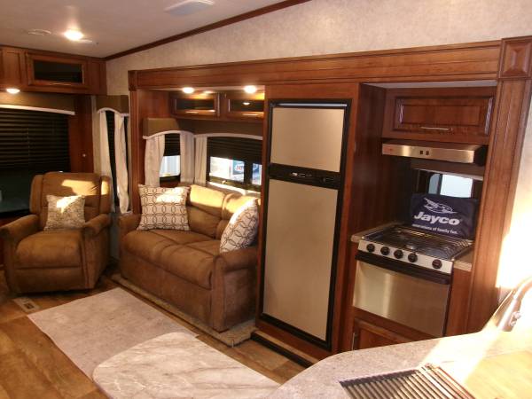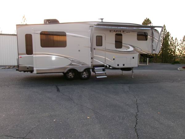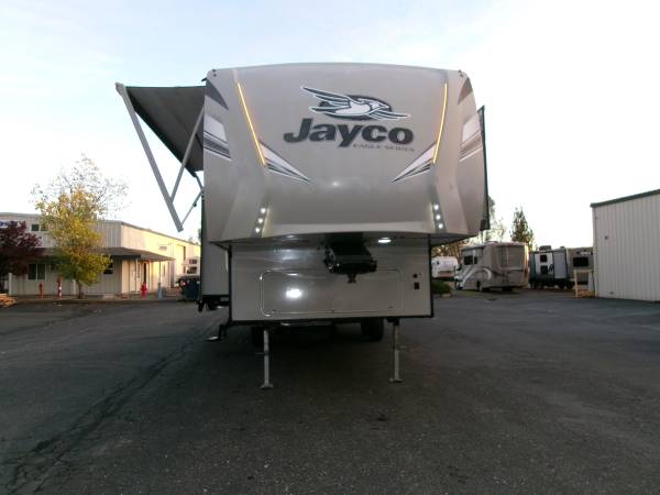 THIS 2018 JAYCO EAGLE 27.5 RLTS 3 SLIDE 5TH WHEEL IN GREAT CONDITION!! THE EAGLE IS ONLY 31' LONG, SOFA SLEEPER, 2 RECLINERS, FIREPLACE, DUAL ENTRY INTO BATHROOM, SLEEPS 4, GREAT CLOSET SPACE, ELECTRIC AWNING WITH LED LIGHTS, OUTDOOR SPEAKERS, BACK UP CAMERA READY, ELECTRIC LEVELING JACKS, FRAMELESS WINDOWS, AND MUCH MORE!!