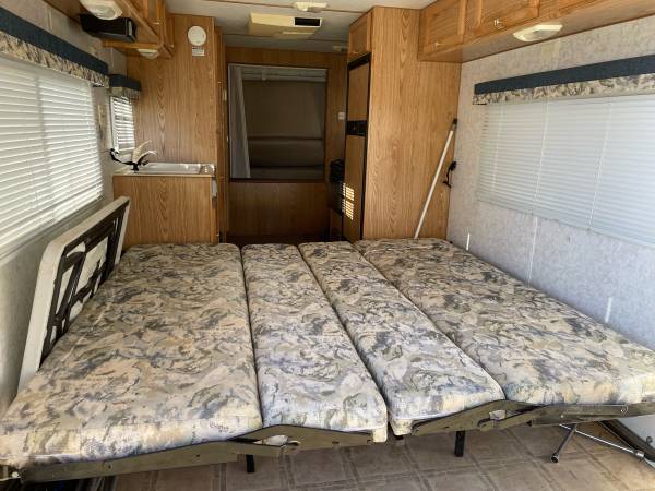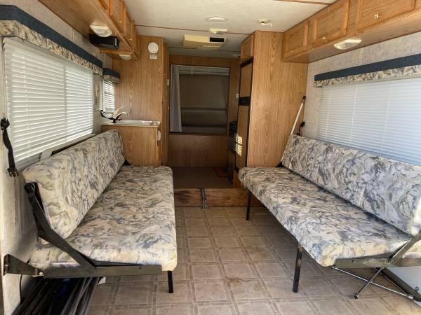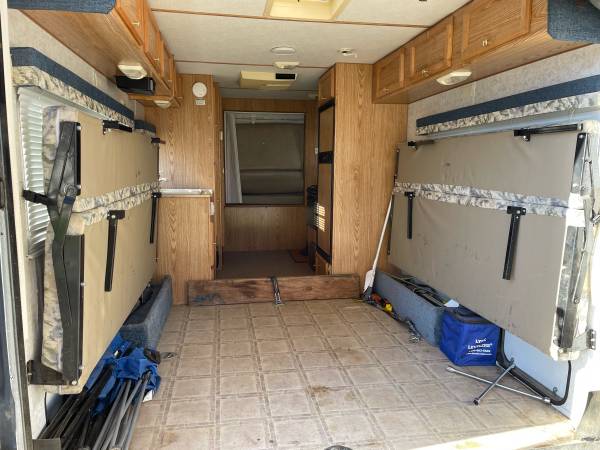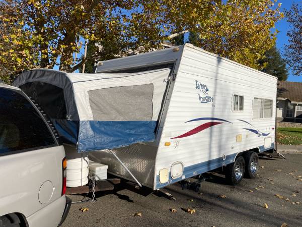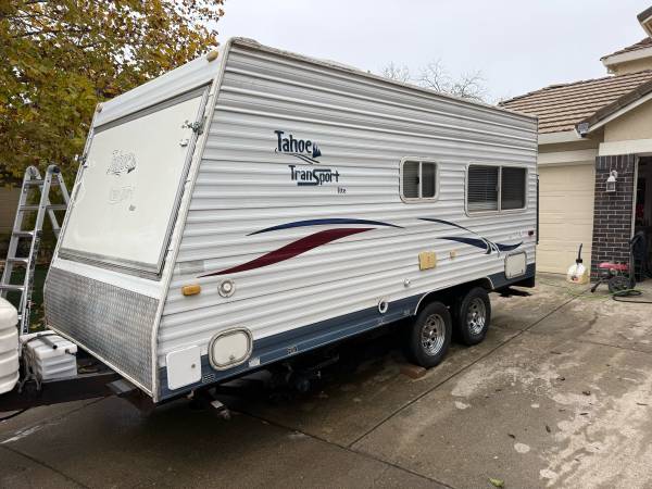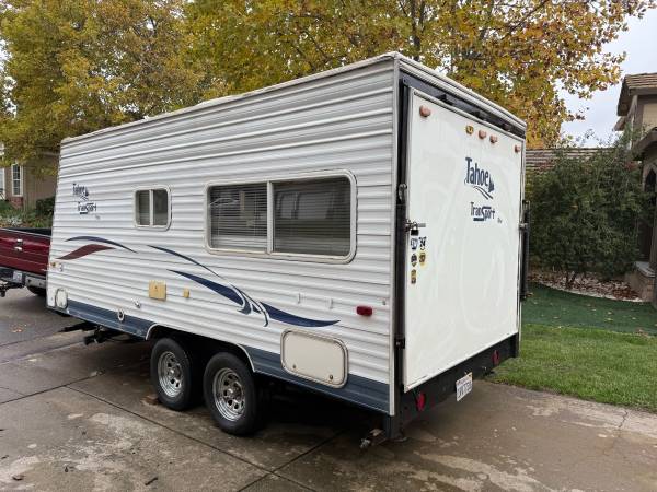 A lightweight easy to pull small toy hauler. Only 3700 lbs. sleeps 4 or 5. Roof was professionally redone 4 years ago. All appliances work properly. This includes roof A/C, heater, refrigerator, water heater, stove, shower, toilet. Perfect for small toys, 2-4 motorcycles. 2 6v batteries, 2 propane tanks. Includes full RV cover and new awning struts that were just purchased and still in box. Call nine one six-539-0601. In Sacramento area. Don’t text, I won’t respond.