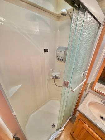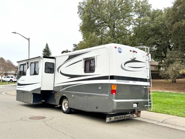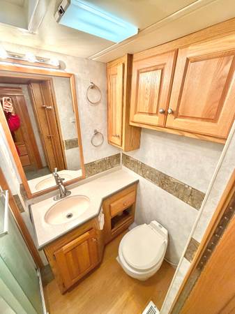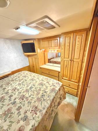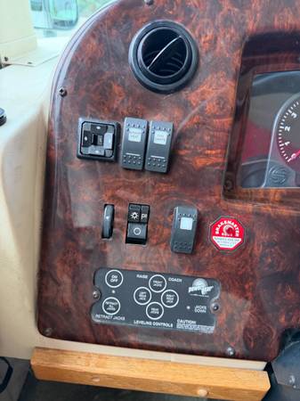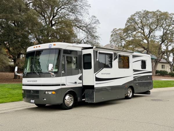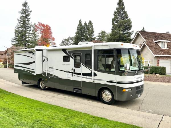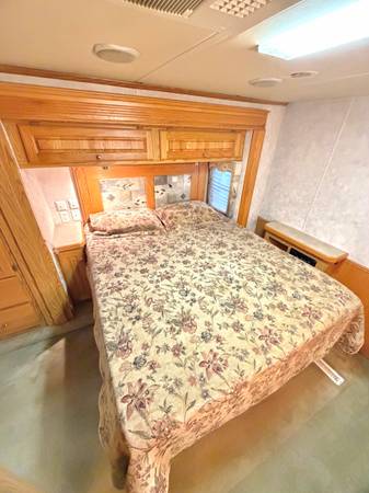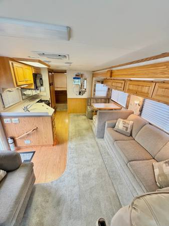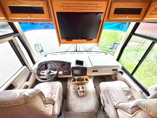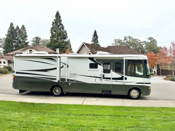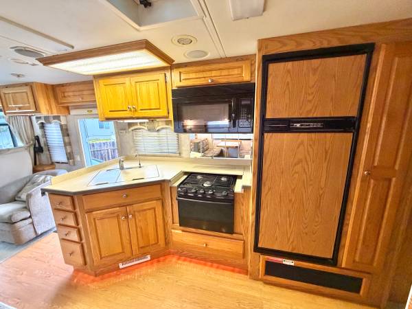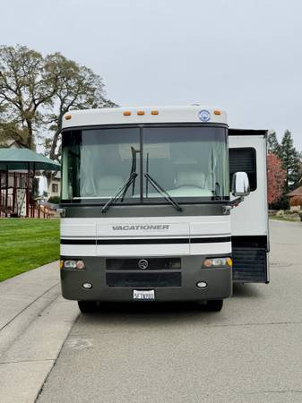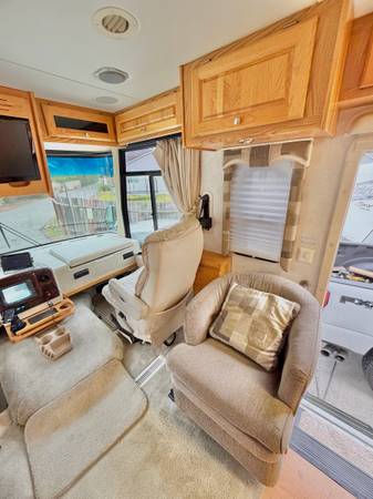 Equipped with 8.1L Chevrolet Vortec gasoline engine built on a Workhorse chassis with 79k original miles hydraulic leveling jacks electric entry steps double slide outs awning onan marquis gold 5500 watt generator with 854 hours dinette table and couch makes into beds swivel chair captain swivel chairs dash A/C and heat central A/C and heat three burner stove/oven refrigerator/freezer microwave. Everything works great no problems or issues at all. Motorhome runs great. And strong basement model lots of storage in and out back up camera driver’s door queen size walk around bed two TV’s full size bathroom non smoker no pets super clean in and out