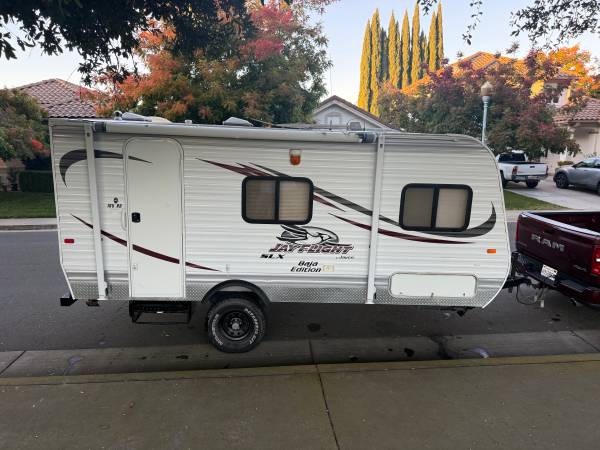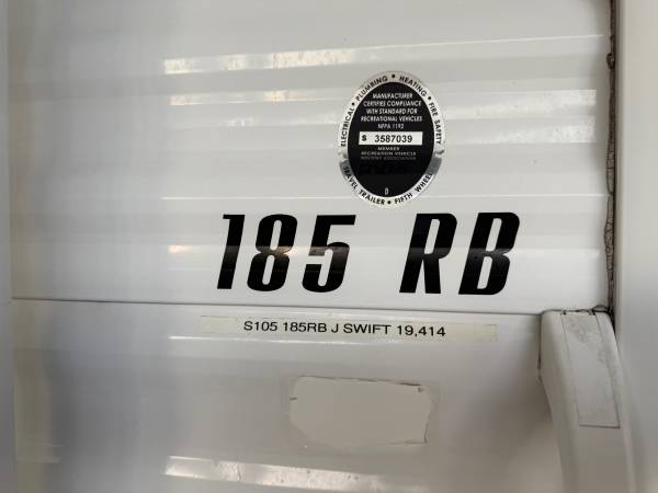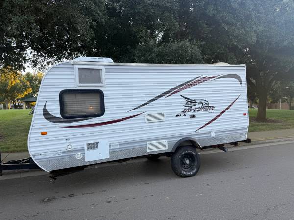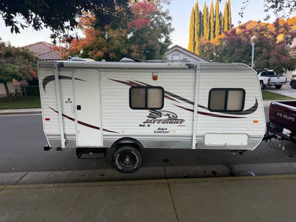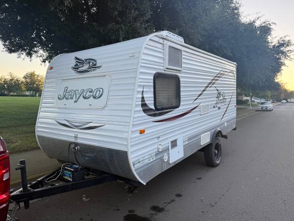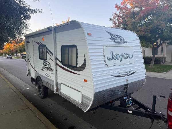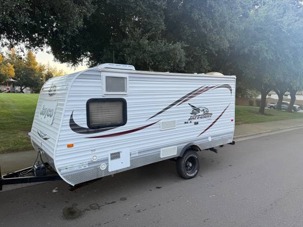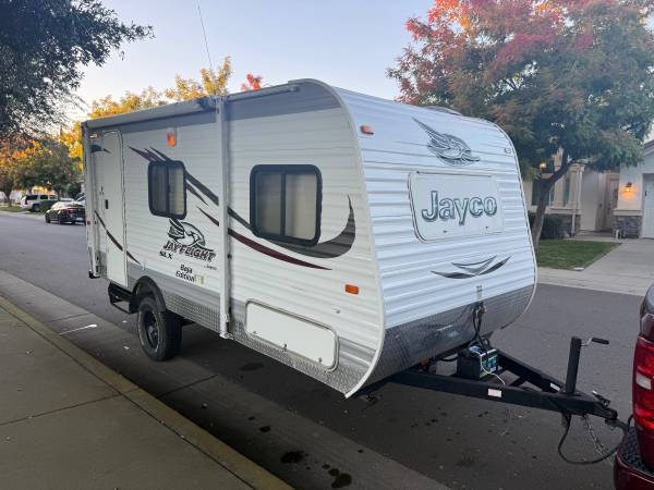 The Jayco Jay Flight 185 RB is a lightweight travel trailer with a front queen bed, a rear bathroom with a tub/shower and toilet, and a central kitchen with a dinette, sink, two-burner stove, and refrigerator. It is designed for easy towing, often by an SUV or smaller truck, and includes amenities such as a furnace, air conditioning, and a patio awning.