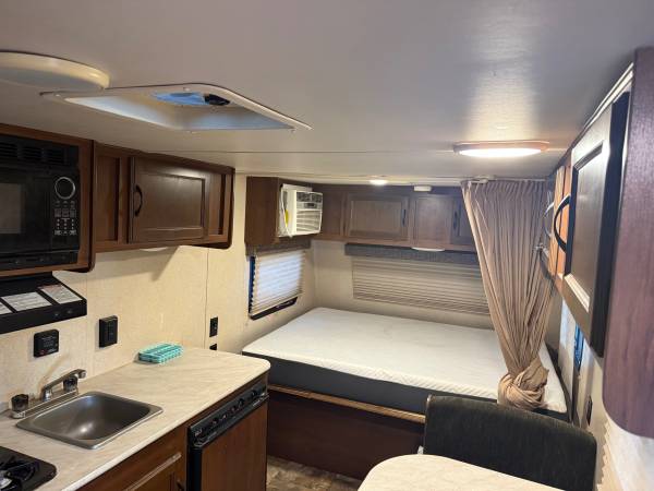 Sleeping areas: Queen bed in the front, with storage accessible from inside and outside; a two-person dinette that can convert into a bed.